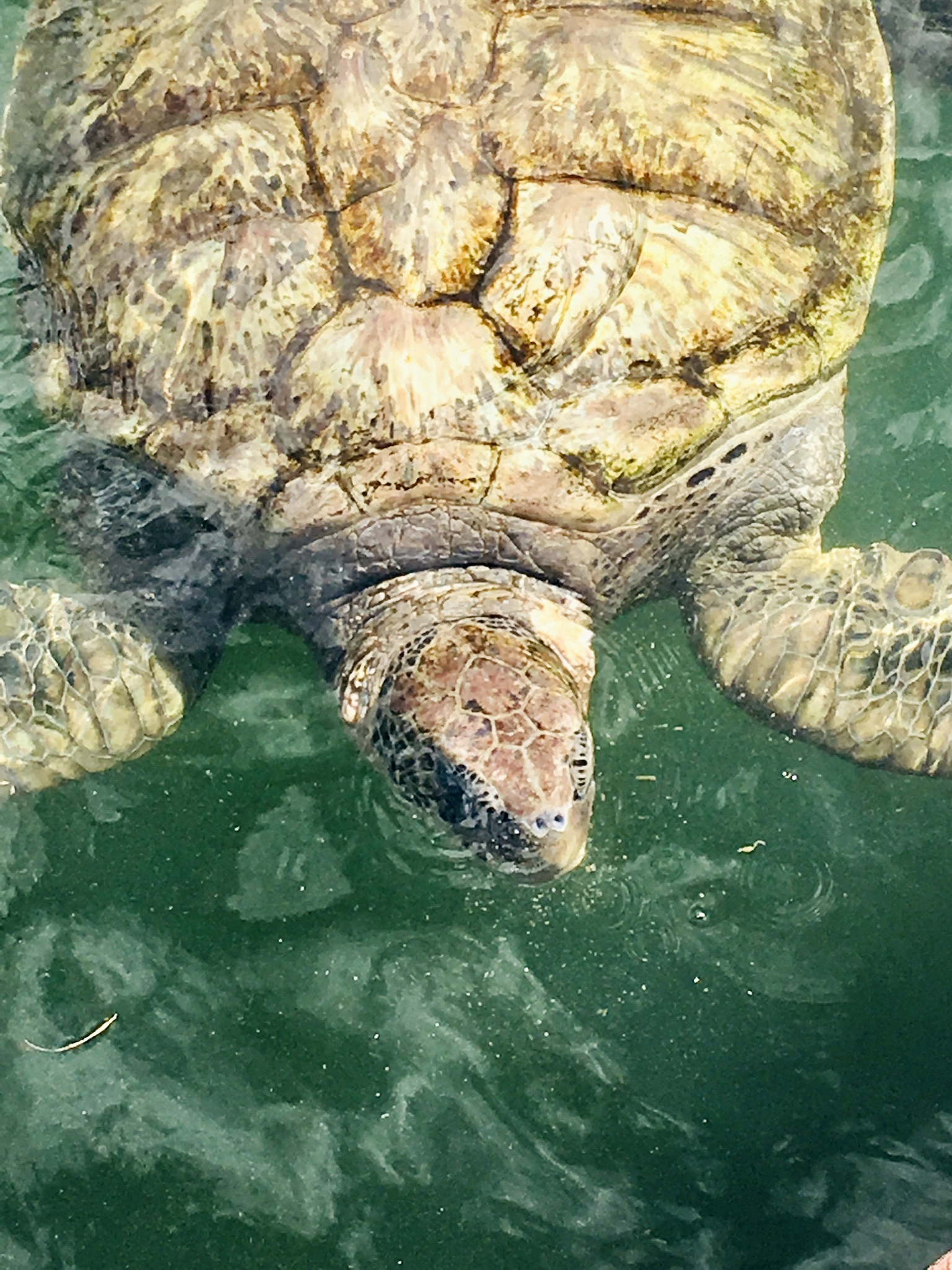 We arrived at the Sea-Turtle Sanctuary just as the gates opened. Upon entering there are some pretty cool displays and literature present however the main attraction is around a corner and through the glass doors. After Kris and I messed around with vacant sea-turtle shells and whatnot we ventured outside to check out the “Turtle Pool.” I’ll be totally honest with you here, I love turtles… but only to look at. I do not want to hold them, they are kind of snappy and slimy, not really my thing… Kris however, she was ready to dive into the water and ride one!