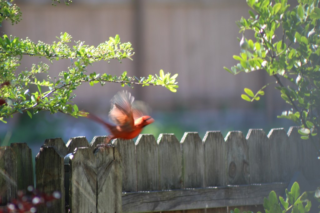 After I had captured a dozen or so images of her, I swung my focus toward the male, who at this time had moved clear across the yard behind the crepe myrtle. As always, the male is bold red, orange beaked with a black ringed face. I managed to catch a few images before he took flight.