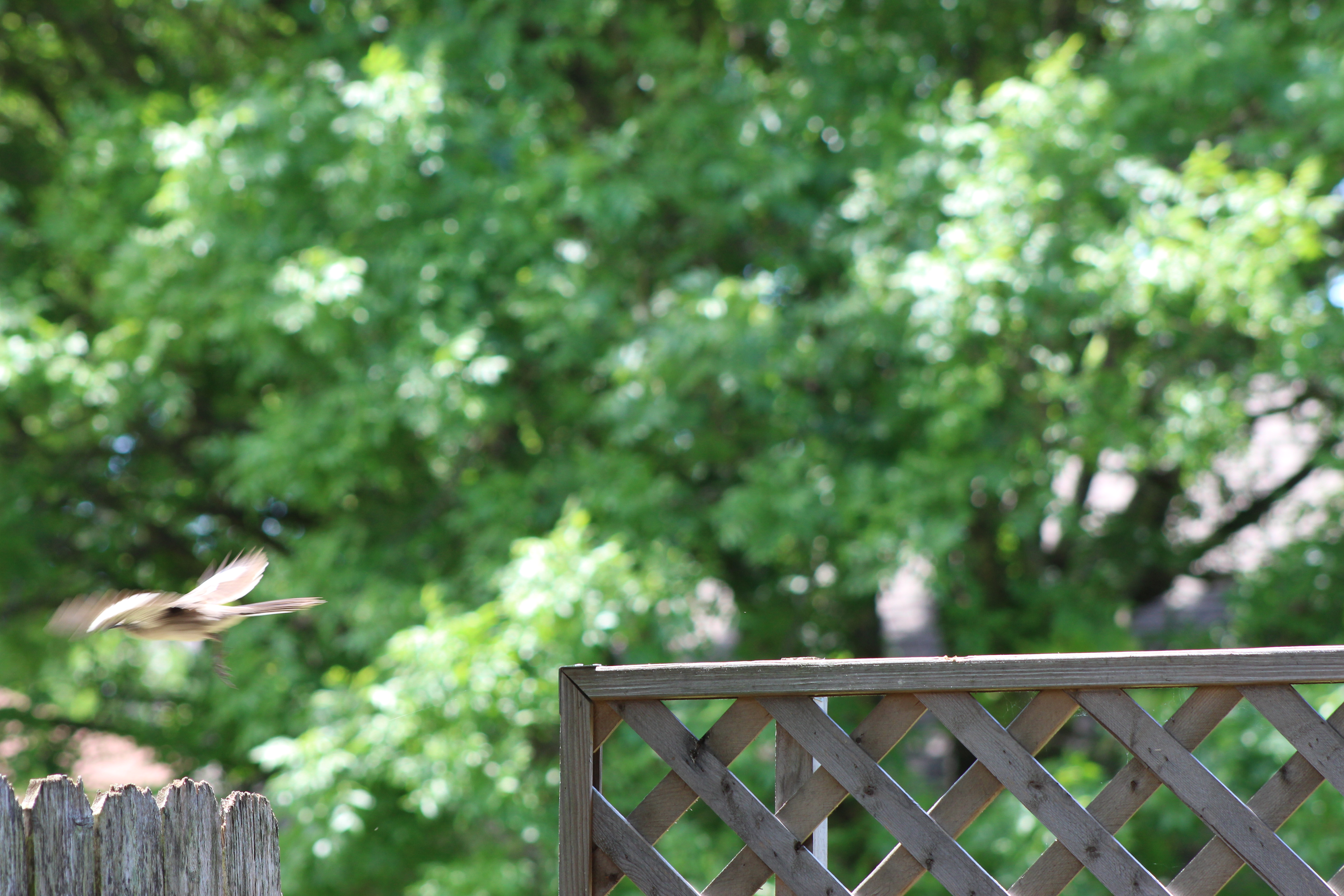 Unlike so many other “excursions” into my backyard, this one was not accompanied by alcohol or stumbling and falling in an amusing manner. This day I simply walked outside on the patio and sat on the bench with my camera. As a budding wildlife photographer (an overly optimistic appraisal of my current skill-level), I’m still learning techniques, composition and settings. Honestly, I really just enjoy the hunt. I get a real sense of enjoyment sitting outside on a nice evening, camera over my shoulder just listening to the birds and other neighborhood sounds.