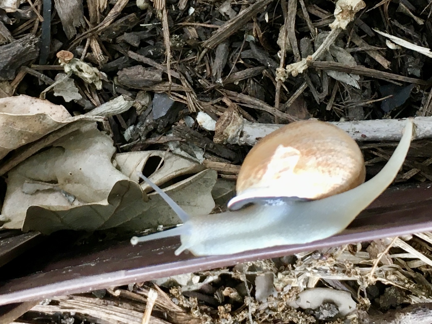 I was out in the back garden doing some pruning of the Eunymous and stumbled upon a little snail who was just doing his or her thing. Never one to miss a “photo-op,” I whipped out my camera and grabbed a few images of the little fella.