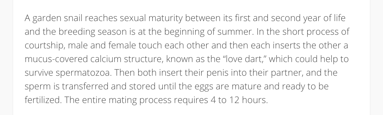 In regard to reproduction, these gastropods are hermaphroditic. To the un-woke, that means these little ones carry both male and female reproductive organs. According to “Snail-World.com,” this doesn’t keep them from mating. Apparently a pair of snails will mate somewhere between… 4 and 12 hours! I’ve included a screen-capture of that fact from Snail-World.com because… they use the phrase, “love-dart.”
