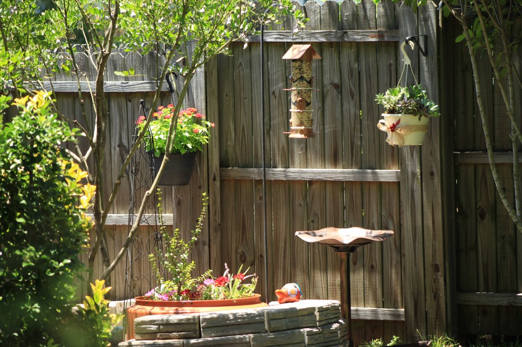 Next, I used some landscaping stones that had been stacked away in the corner of the yard to build a small retaining wall around the aforementioned planter. I then moved an unused shepherds hook as well as some plant hanger hooks I’d had in the garage collecting dust into that area of the yard. With things beginning to come together, Kris and I visited the Home Depot and picked out some hanging plants, summer flowers, a bird bath and new bird-feeder (the old one broke horrifically from a close encounter with a diabetic squirrel earlier in the day).