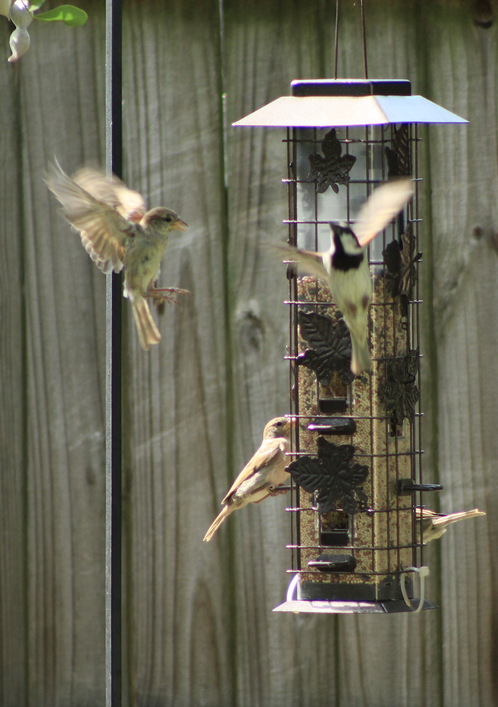Anyway, the House Sparrow associates with humans and is one of the most widespread and abundant songbirds in the world. I suspect that this may be the primary reason that I have so many. Not to mention since the feeder and sanctuary are in full effect it could only serve as a multiplier. Don’t get me wrong, I love having all these little songbirds around, but I would like more of a variety. I have not changed up the food yet as I have quite a bit and do not want to waste it or have six or seven types opened up at once.